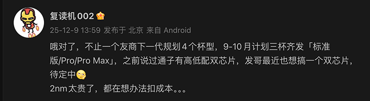 除了这个,博主还提到明年的旗舰们大概率都要用上2nm芯片,不管是苹果的A20还是高通的第六代骁龙8至尊版、联发科的天玑9600,大家的竞争会更激烈。