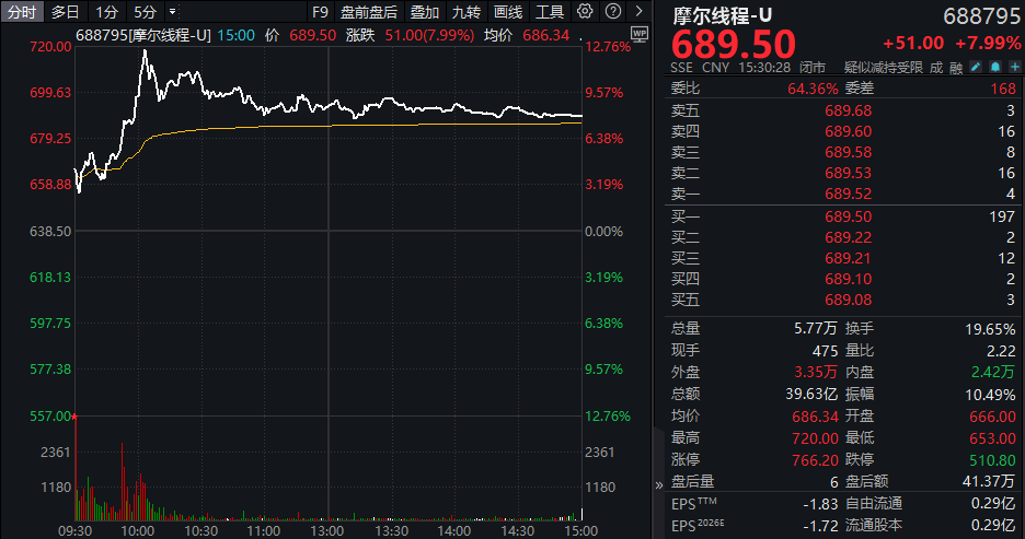 摩尔线程今日股价的强势表现或与其昨日交出的一份首次扭亏、净赚近3000万元的一季报有关。2026年前三个月,公司实现营业收入7.38亿元,同比大增155.35%;归母净利润2935.92亿元,同比扭亏为盈。虽然摩尔线程一季度的扣非归母净利润仍为负值,但亏损幅度较上年同期收窄了60.10%。